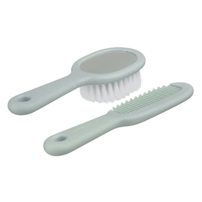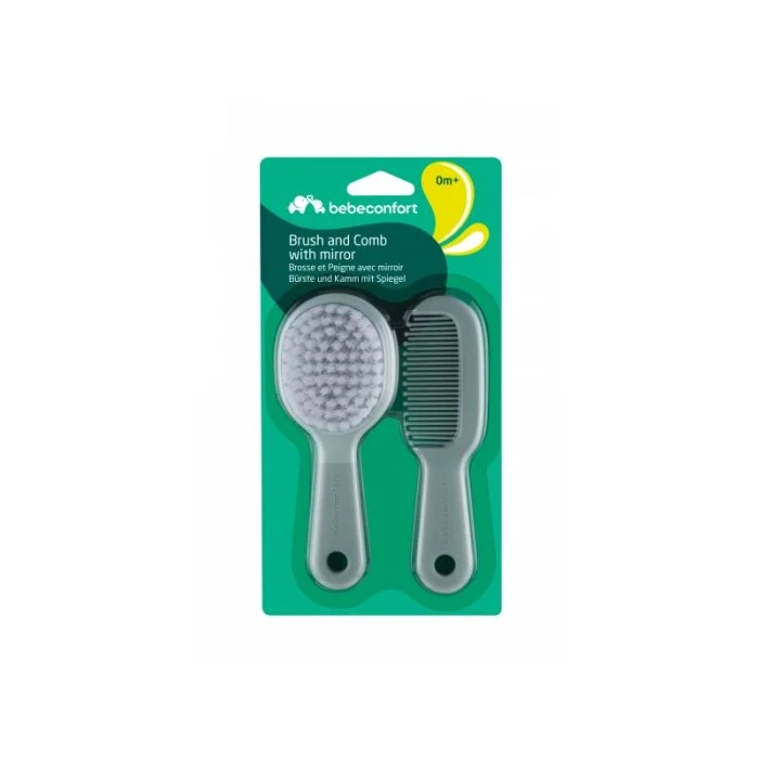 The kit for caring for your baby’s hair from birth includes a brush with soft bristles, and a comb with rounded teeth. The brush has a little mirror on the underside.