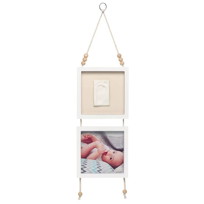 A perfect addition to a perfect nursery.The Baby Art Hanging Frame will complement any decor. With 2 frames, 1 to display a photo of your choice, and the other to display a hand or footprint.