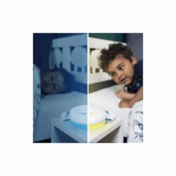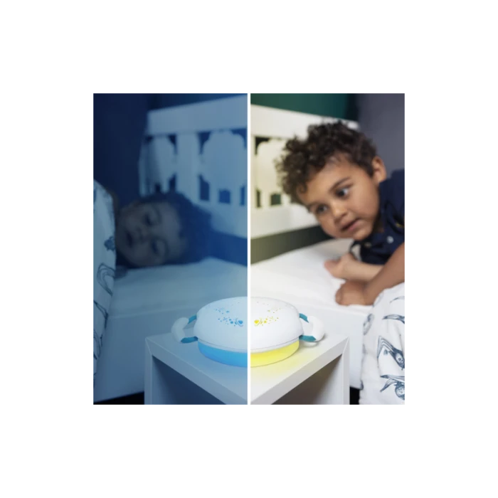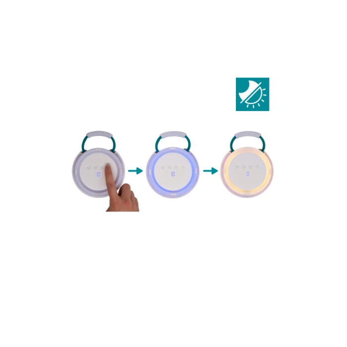 Simply activate Dreamy’s sleep function at bedtime and your child’s preferred sleep duration. You can choose up to 12 hours. Your baby’s nursery is bathed in a soft blue light which lets them know it’s time to sleep! After the programmed sleep duration is up, Sleepy will emit a contrasting warm yellow glow like the sun which will gently encourage your child to wake.