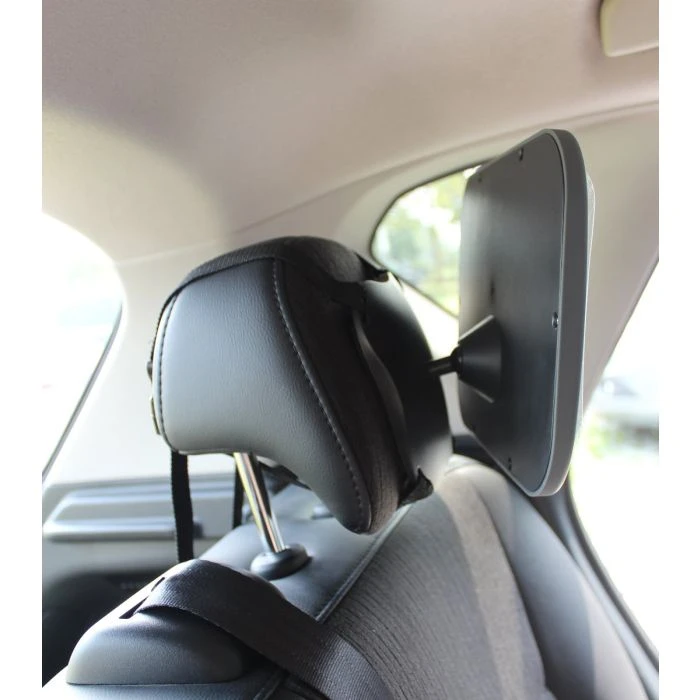 The Bella Baby rear view car mirror safely and securely attaches to the rear headrest to give the driver a perfect view of baby while the child is in a rear facing car seat.