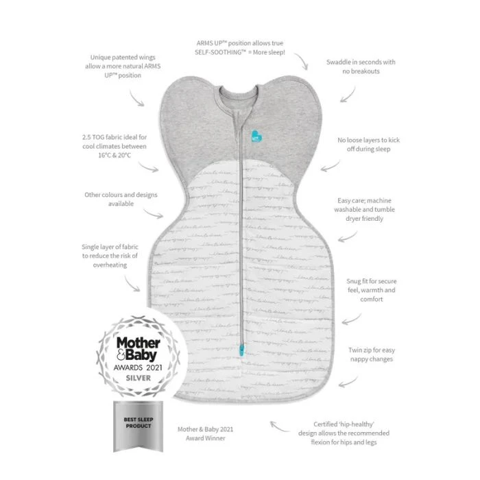 The Love To Dream Swaddle UP Warm is a Stage 1 sleepsuit made with soft bamboo, featuring ARMS UP™ and a hip-healthy design that works with your baby’s natural sleeping position to give both parent and child a restful night’s sleep. With the ARMS-UP™ design, your baby’s arms are close-by, allowing for true self soothing. Medical research shows that being able to gently rub their cheeks and suck their fingers gives a baby a better night’s sleep.
