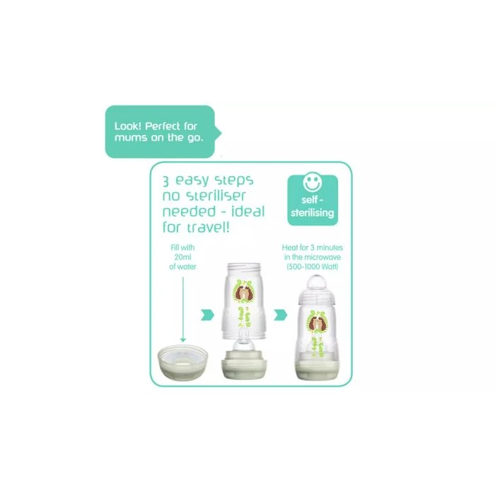 MAM Easy Start Anti Colic is the ideal bottle for an easy switch between breast and bottle thanks to the SkinSoftTM teat which provides a familiar feel for babies. Market Research confirms that 94% of babies accepted the teat first time. The vented base provides an even drinking flow so babies drink relaxed, without swallowing air bubbles helping to reduce colic in 80% of babies and the bottle can be self-sterilised in the microwave in just 3 simple steps, without the need of a separate steriliser. Ensuring simple cleaning on the go!