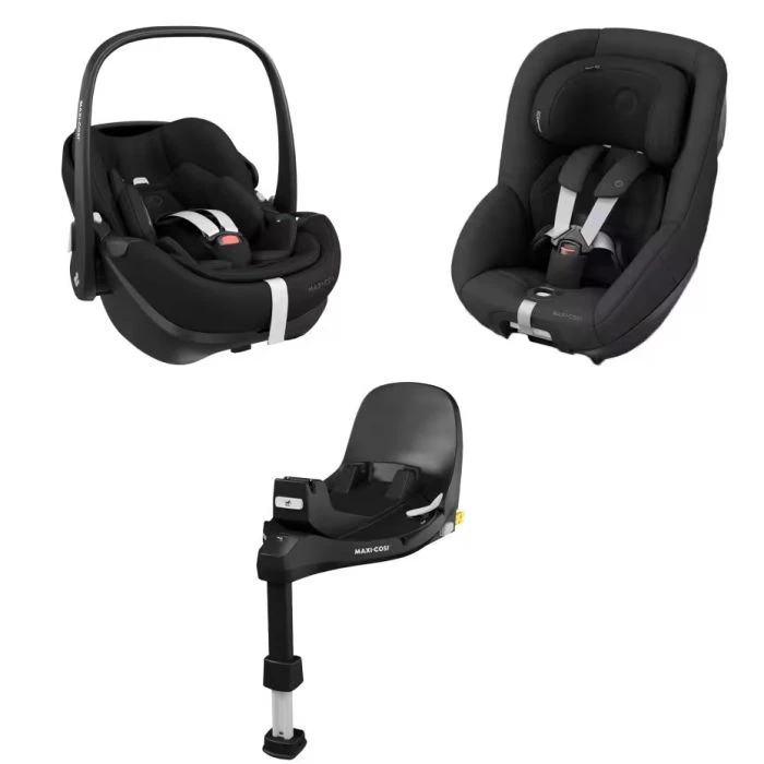 Including Maxi cosi Pebble 360 Pro and Pearl 360 Pro car seats with FamilyFix 360 Pro slide and swivel base this bundle can be used from birth to 4 years!
