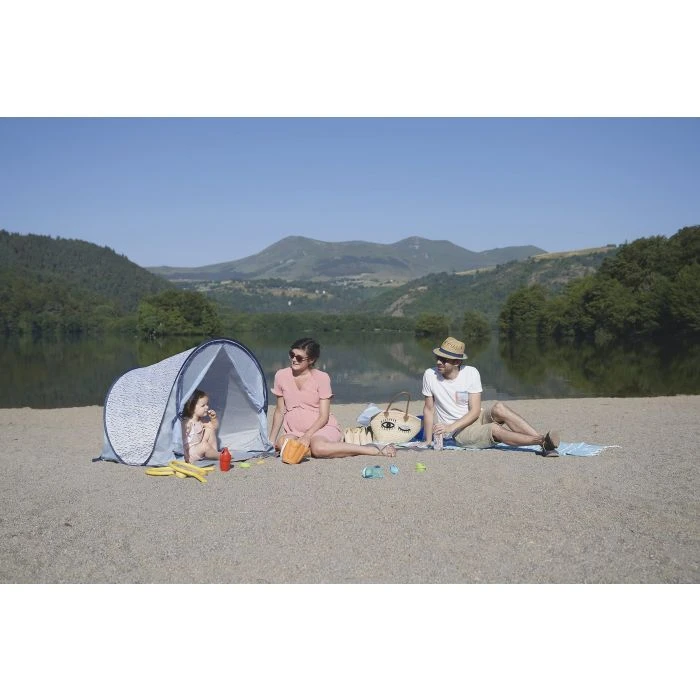 The Babymoov anti-UV tent is very easy to set up thanks to its pop-up system. It includes tent pegs to secure into the ground. The anti-UV tent has large central zipped opening made from a fine mesh mosquito net for protection against insects. It also has two ventilation windows with flaps at the back for increased air flow on a hot day.