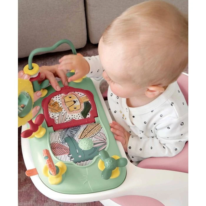 - Play Tray includes 6 interactive features including: a beaded loop, spinning flower, twisty bendy stalk, a teether and picture book with baby safe mirror