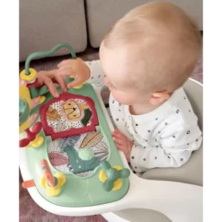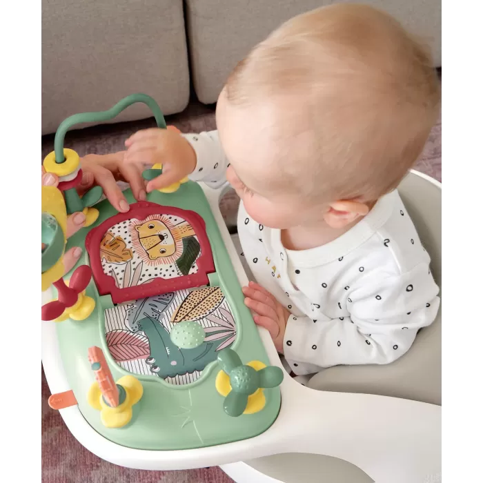 - Play Tray includes 6 interactive features including: a beaded loop, spinning flower, twisty bendy stalk, a teether and picture book with baby safe mirror