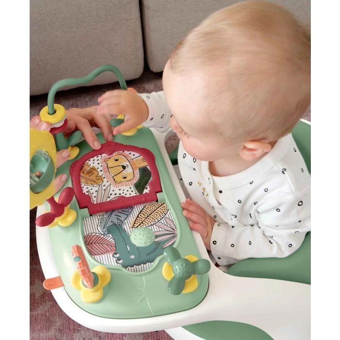 - Play Tray includes 6 interactive features including: a beaded loop, spinning flower, twisty bendy stalk, a teether and picture book with baby safe mirror