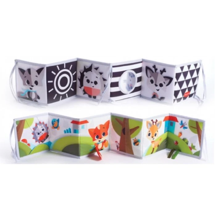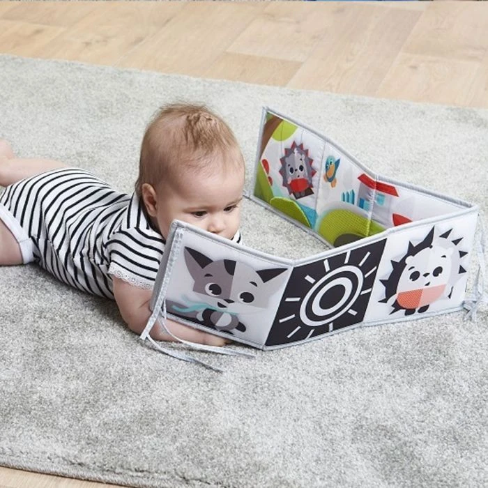 Dual stage developmental baby book with 7 activities and two sides: one black & white the other colourful